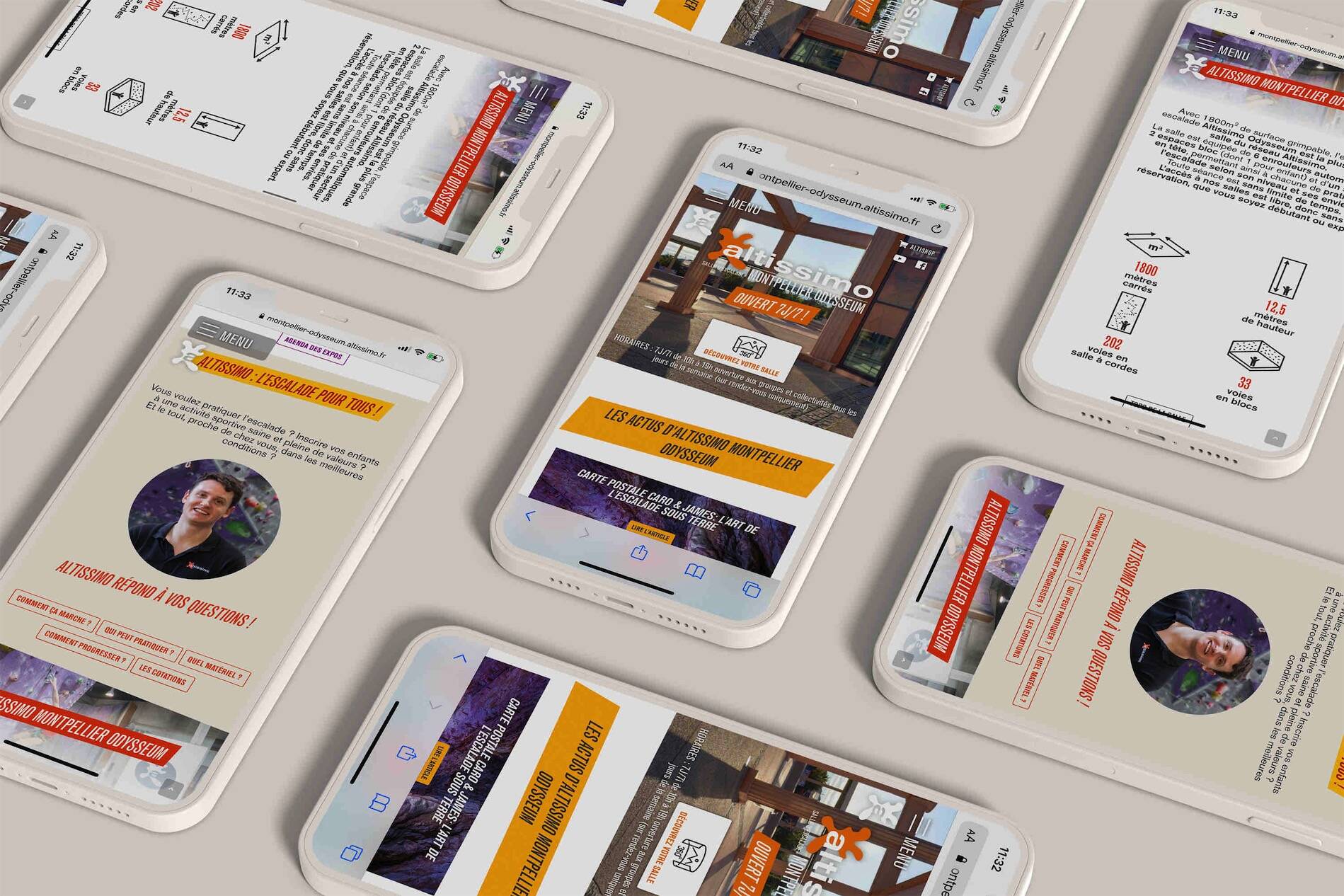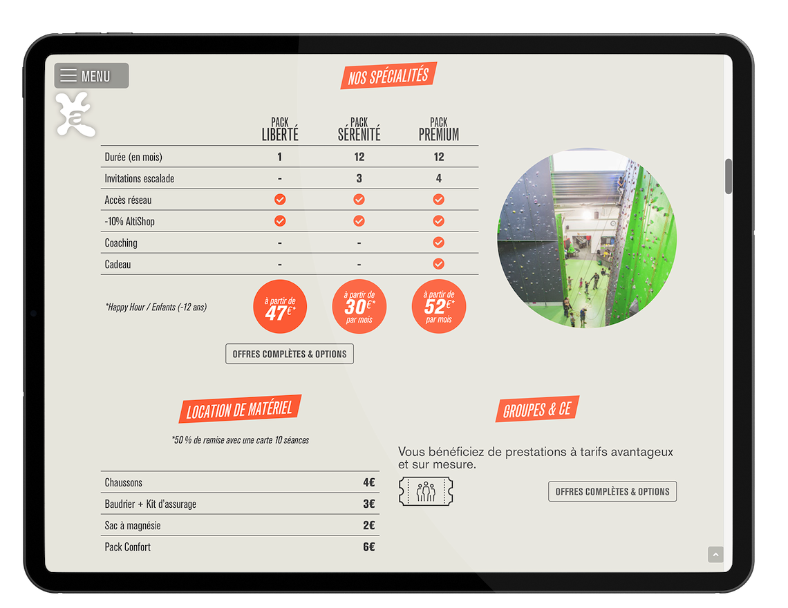 Véhiculer une image de marque attractive et cohérente, favoriser une meilleure expérience utilisateur et une navigation plus intuitive : choix d'un design coloré et fun qui se rapproche de l'univers structural des salles d'escalade Altissimo et veillant à optimiser l'expérience mobile pour une cible consommatrice de nouvelles technologies.