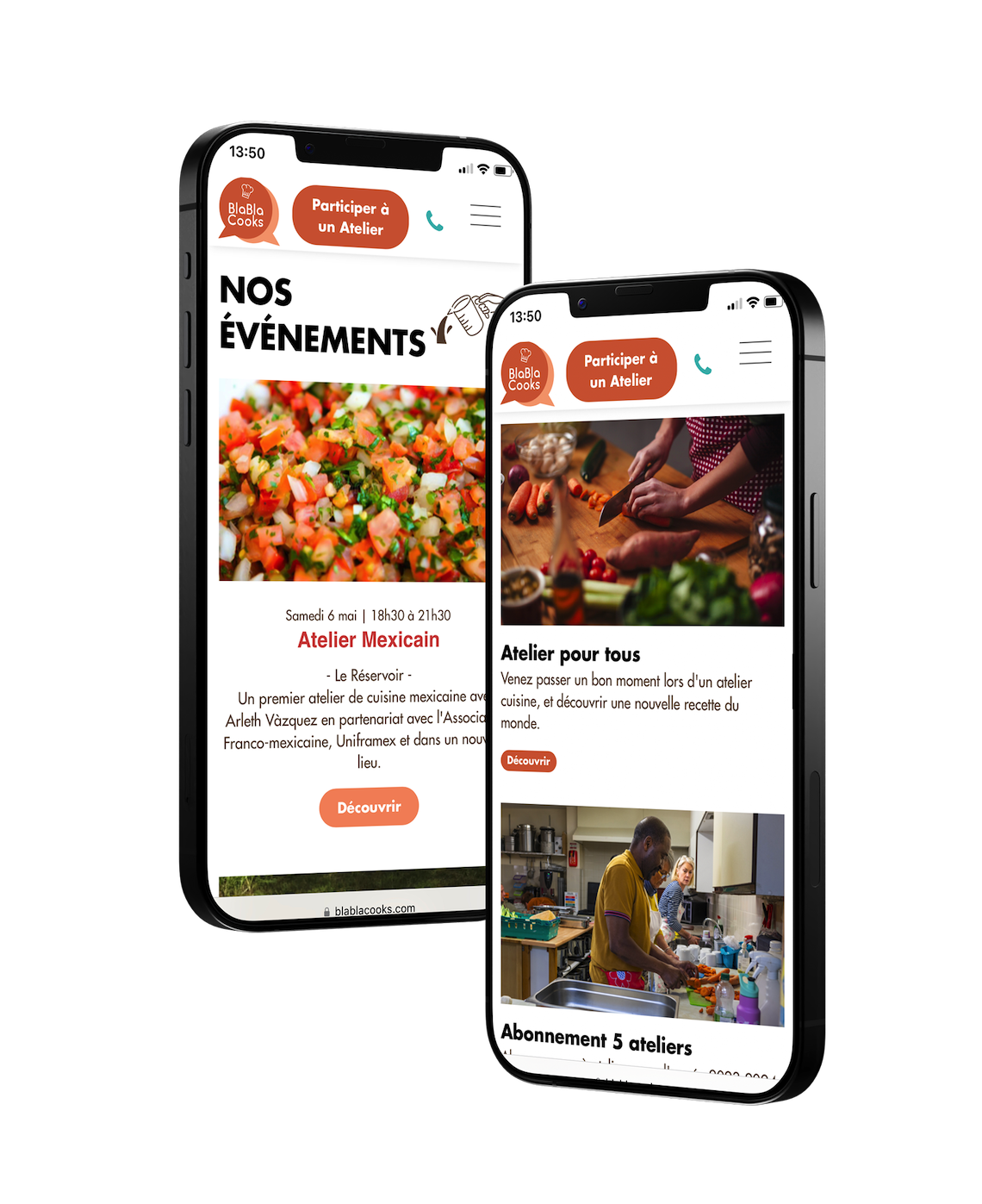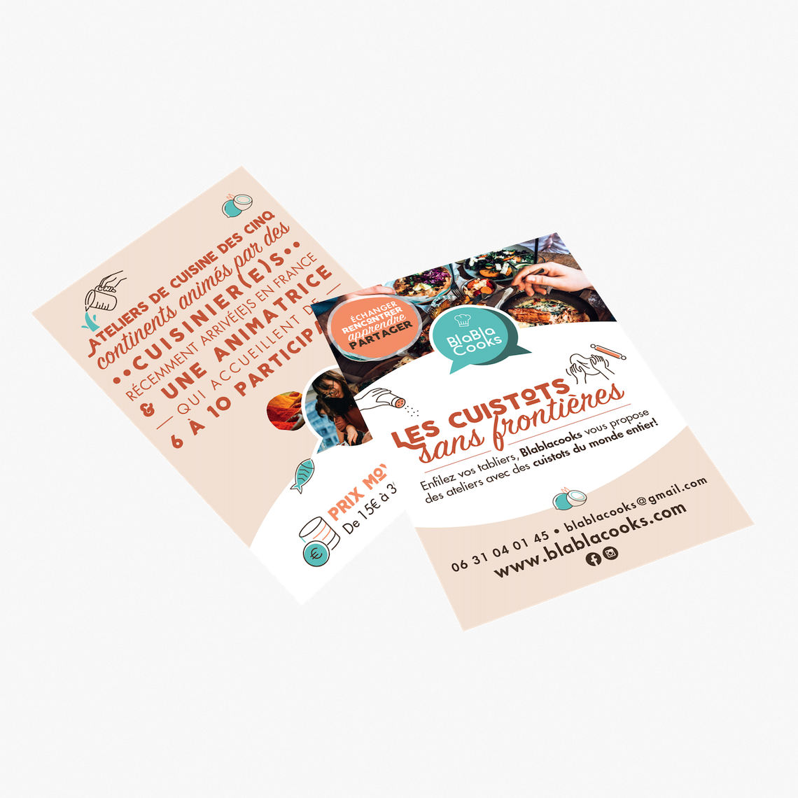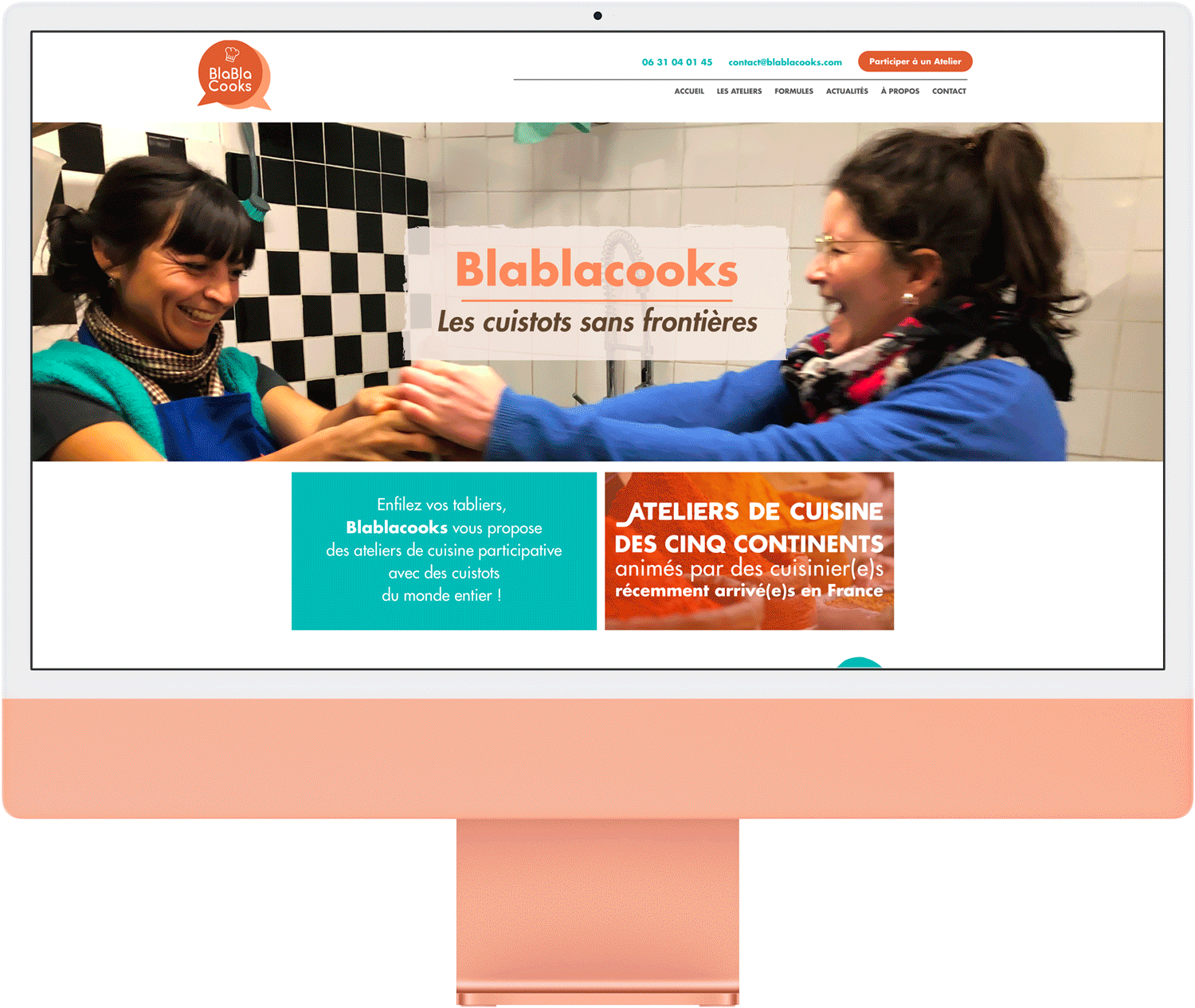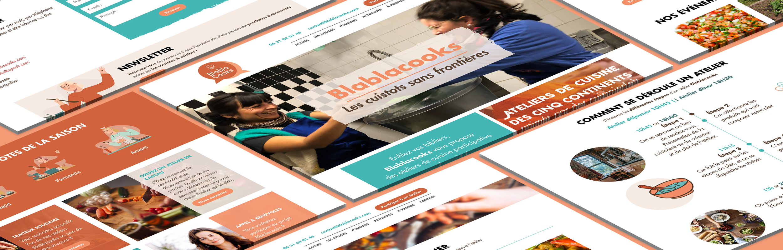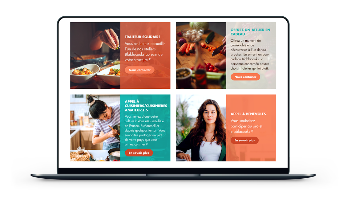 Nous avons réalisé une charte graphique colorée et joyeuse, pour représenter l'ambiance des ateliers de cuisine Blablacooks. Au travers de cette charte graphique, l'objectif était de représenter toute la mixité présente au sein de l'association Blablacooks. Le site devait être facilement accessible pour tous, et facilement compréhensible.