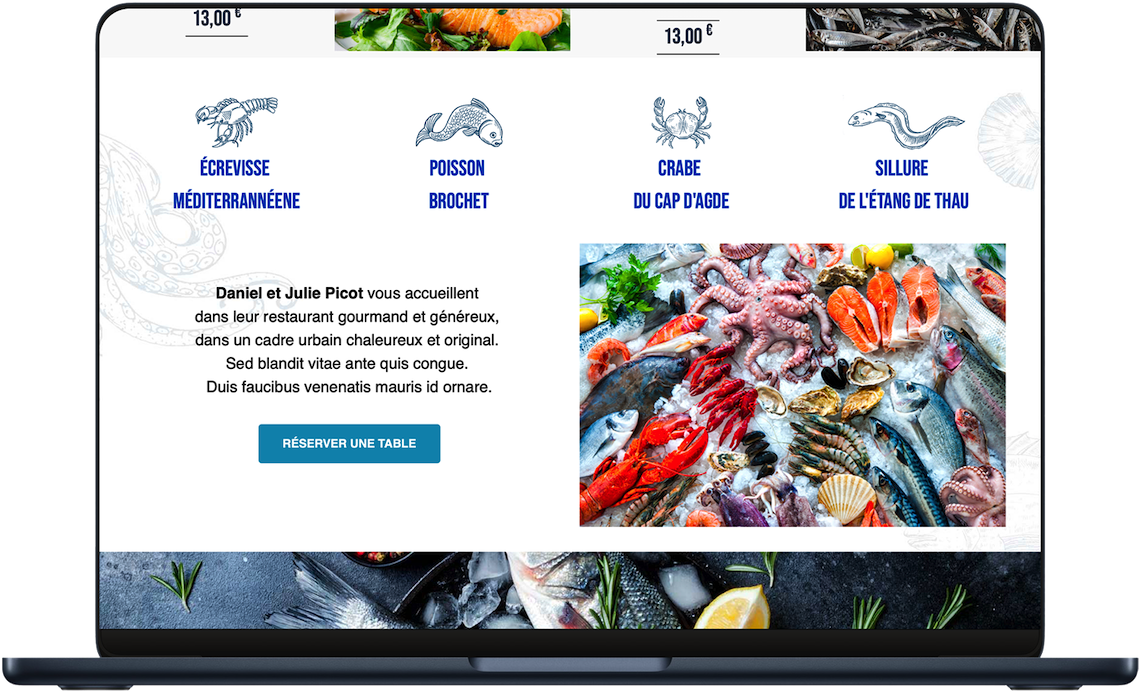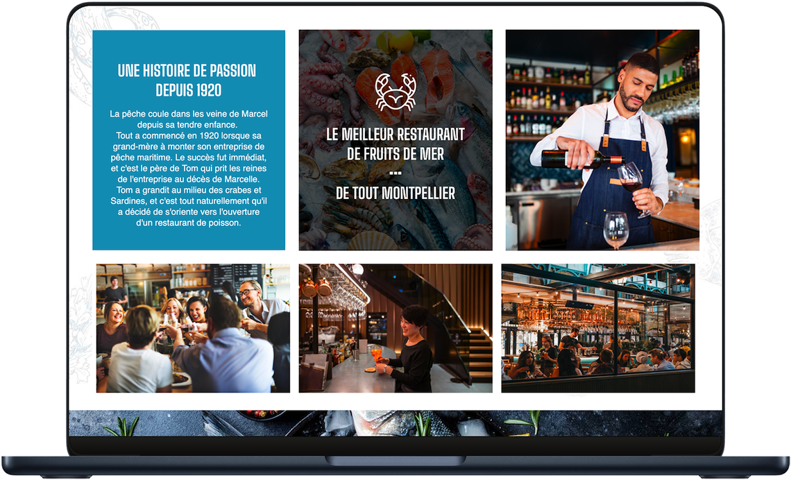 Le restaurant se distingue par la qualité de ses produits et par leurs origines. Le séduction par l'image par à travers la mise en scène de beaux visuels est un critère de réassurance pour les visiteurs et permet d'assoir la réputation du restaurant.